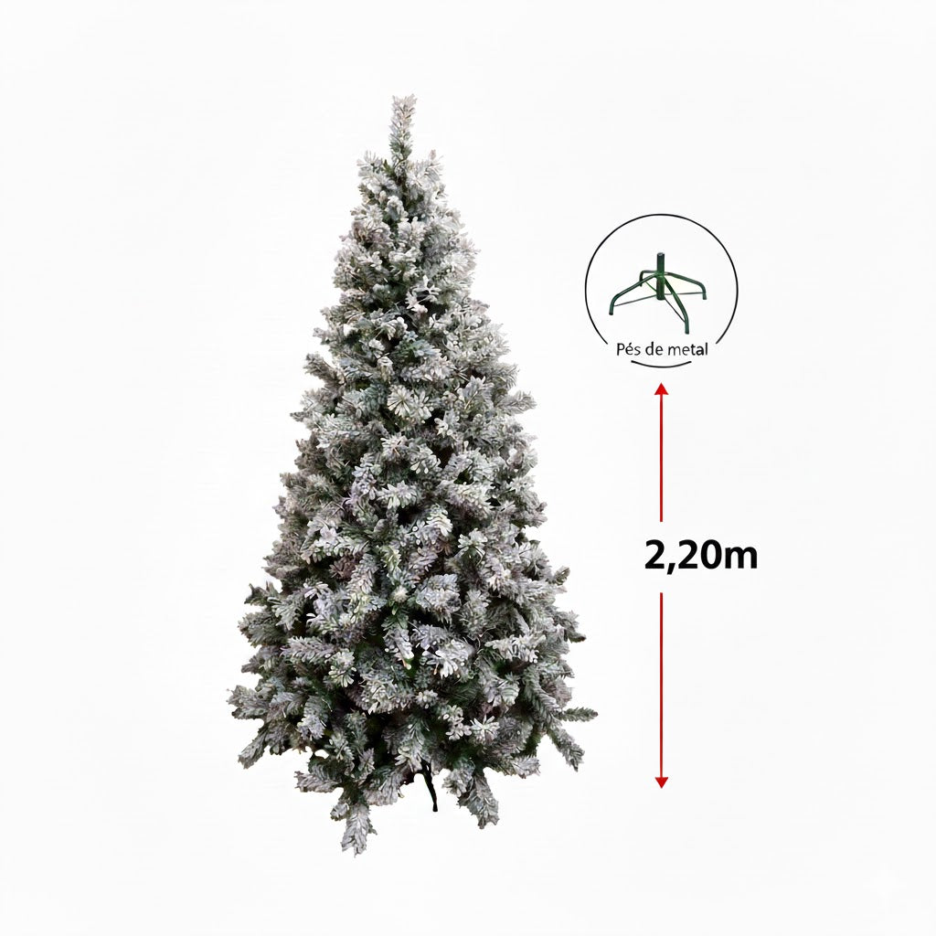 Disponível nos tamanhos 1,80m e 2,30m, ela possui galhos densos, volumosos e um acabamento nevado delicado que cria profundidade e um efeito visual impressionante. É perfeita para quem deseja uma árvore alta, imponente e cheia de presença.