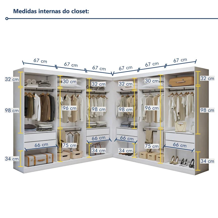 O Closet Colorado transforma a rotina em praticidade. Sem portas, ele deixa todas as suas peças à vista, como em uma vitrine pessoal, facilitando a escolha do look no dia a dia. As 8 gavetas oferecem organização perfeita para roupas menores e acessórios, enquanto a estrutura espaçosa acomoda desde vestidos longos até ternos, com charme e sofisticação.